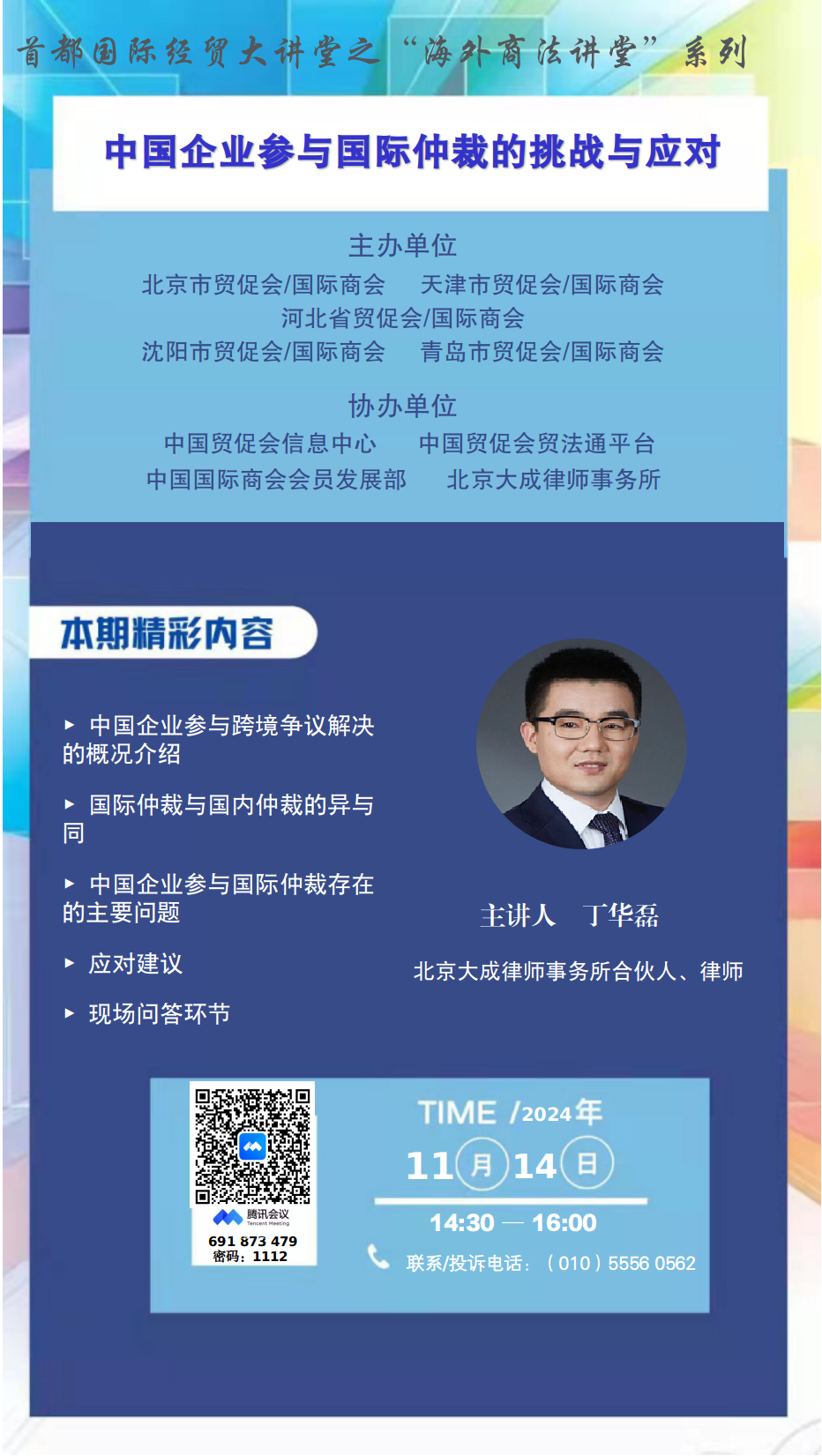 讲座议程以当天安排为准。为确保针对性和实效性,关于国际仲裁如有希望了解的问题,可于2024年11月13日17:00前反馈至北京市贸促会法律部,工作人员将择典型问题提前提供给主讲人进行针对性解答。