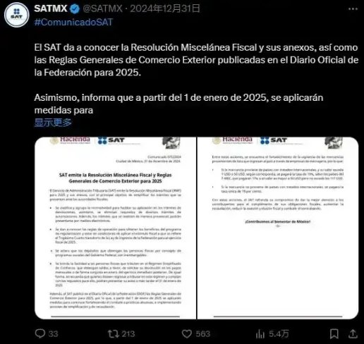 具体而言,根据《美国—墨西哥—加拿大贸易协定》,经由加拿大和美国快递公司入境且价值在50美元至117美元之间的货物将被征收17%的关税;而对于来自与墨西哥签订了国际条约的其他国家,价值超过1美元的商品同样需缴纳19%的关税。值得注意的是,中国作为未与墨西哥签订相关国际条约的国家之一,其国内的跨境电商平台如Shein和Temu或将直接受到这一政策的影响。