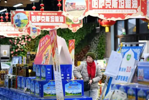 2024年2月1日,在陕西西安,消费者在“中欧班列(西安)进口商品年货节”上挑选哈萨克斯坦粮油产品。(新华社记者 李一博 摄)