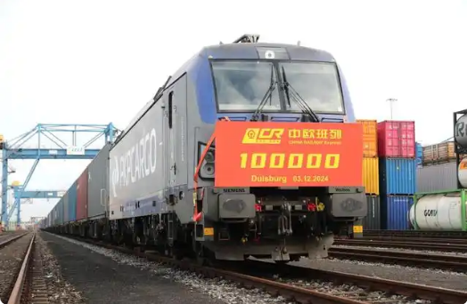 2024年12月3日,从中国重庆团结村中心站开出的第10万列中欧班列X8083次,顺利抵达德国杜伊斯堡。(新华社记者 杜哲宇 摄)