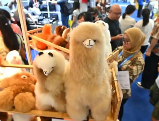2024年9月28日,观众在中国—东盟博览会上挑选秘鲁羊驼毛公仔。(新华社记者 周华 摄)