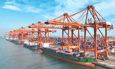 在河北唐山港京唐港区集装箱码头,靠泊的轮船正进行装卸货作业。新华社记者 杨世尧摄