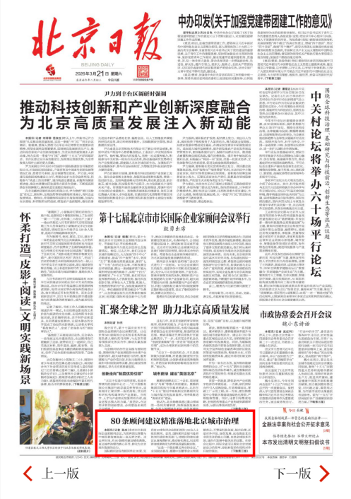 本报讯(记者 孙杰)北京市市长国际企业家顾问会议,为世界顶尖智慧与中国首都发展架起一座无界之桥。过去两年间,有80条顾问建议精准落地,直达城市治理的核心环节,转化为北京城市发展的动力。