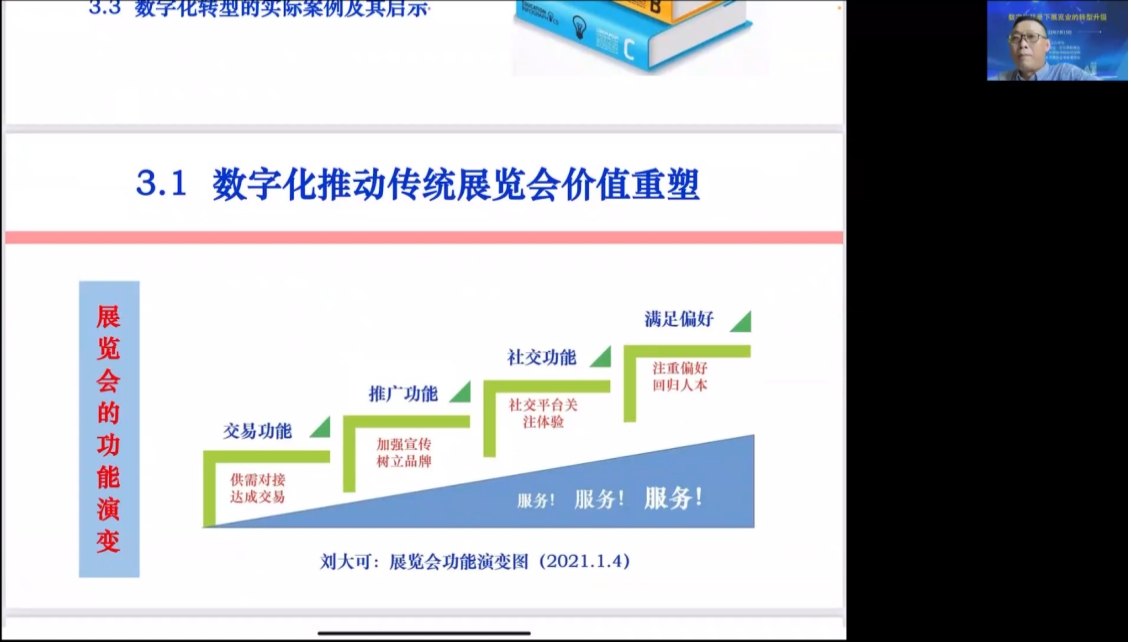 讲座中,刘大可教授聚焦数字化背景下展览业转型升级,从数字活动对展会的功能替代,展览业如何进行数字化转型,以及未来前景等多个层面进行讲解。他强调数字化正在推动传统展览会价值重塑,而展览业数字化转型是一个逐步演化的过程,绝不意味着对传统展会的否定,也不是一个非此即彼的过程。