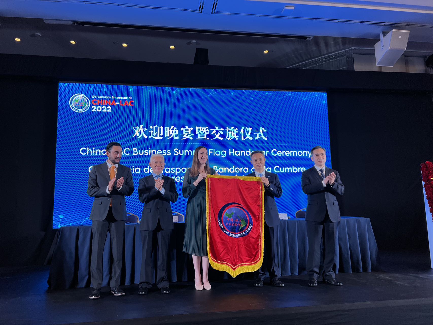 当地时间12 月14日晚,在厄瓜多尔瓜亚基尔市召开的2022年第十五届中国—拉美企业家高峰会举办会旗交接仪式。中国贸促会会长任鸿斌,厄瓜多尔生产、外贸、投资和渔业部副部长加利亚多出席并致辞。中国驻厄瓜多尔大使陈国友及拉美各国有关政府人士、贸促机构和商协会代表、企业家等参加会议。历经申办、考察、评估等,北京成为2023年第十六届中拉企业家高峰会主办城市,北京市政府代表、市贸促会主任郭怀刚从加利亚多副部长手中郑重接过会旗。