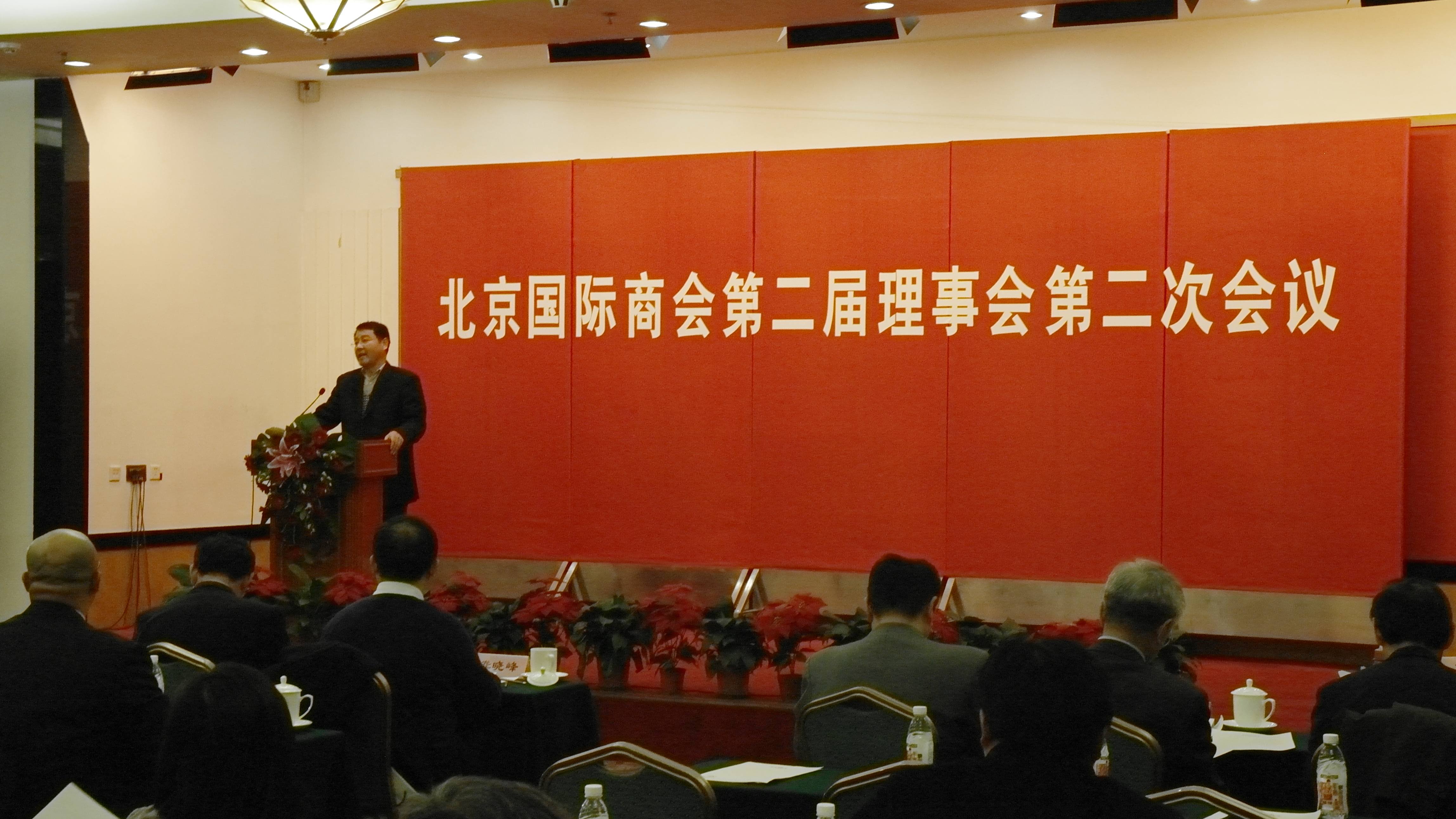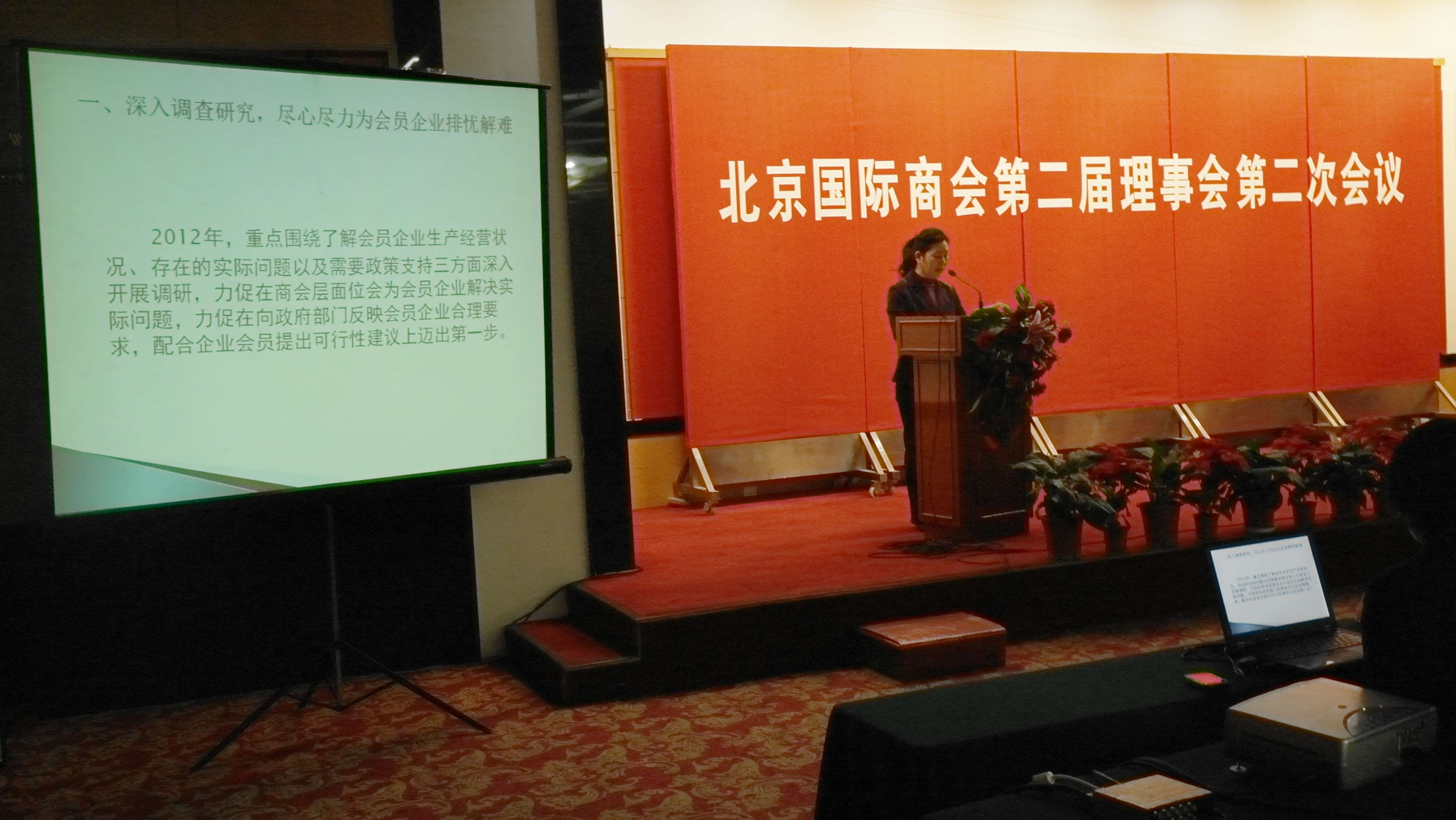 2011年12月14日下午,北京国际商会第二届理事会第二次会议在北京新大都饭店召开。中国贸促会、中国国际商会副会长张伟出席并做了专题报告。会议通报了商会副会长、秘书长、常务理事、监事会、理事变动情况和商会工作机构及人员安排;宣读了新理事侯选人名单,审议通过了新会员名单,商会内部管理制度和2011年商会工作报告和2012年工作设想。推介了北京市贸促会公共信息服务平台-京贸网。商会会员二百余人参加了会议。北京国际商会原秘书长张钢主持了会议。