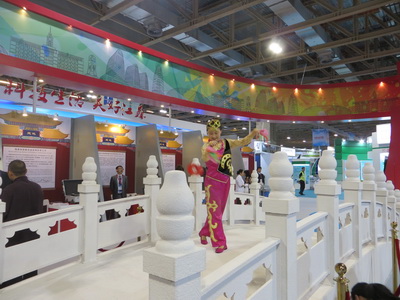 “古都北京·缤纷西城”北京展区面积400平方米,外观以古都北京典型的牌楼和西城标志性建筑金融街的现代建筑为设计灵感,通过实物模型、宣传片、图片、文字等展示“传统与现代结合”的北京西城,在政务、科技、金融、公共服务等方面的资源和成果。展项精选了包括北京鬃人、脸谱绘制、传拓技艺、北京仿古瓷、老舍茶馆茶艺表演、传统药香制作技艺、瑞蚨祥中式服装手工制作技艺非物质文化遗产和老字号,以及活的美术馆、DRC工业设计创意、部分红星奖获奖产品展示、M-pay移动支付等13项文化创意和科技项目。展区中央以西城区著名景点世界文化遗产“万宁桥”为设计元素搭建舞台,现场抖空竹、茶艺和古琴等表演,每天都吸引大量的境内外参观者。