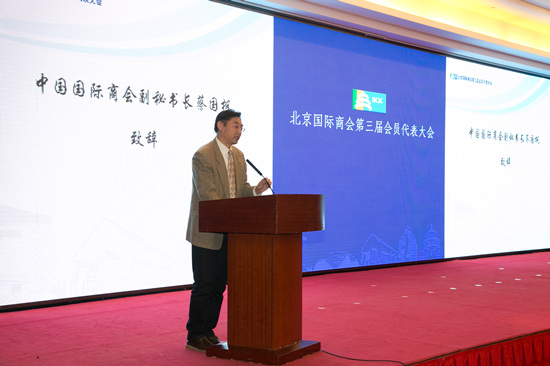 中国国际商会副秘书长蔡国枫表示,多年来,北京国际商与中国国际商会始终保持良好紧密的合作关系,特在服务会员,国际联络交往、会展服务、信息共享方面,建立了经常性的联系机制。希望北京国际商会以本次大会为契机,进一步拓展商会的职能和作用,不断提高服务能力;进一步发挥首都的资源优势,深化与世界各国工商界和商协会的联系合作,为北京贸促事业发展做出新贡献。