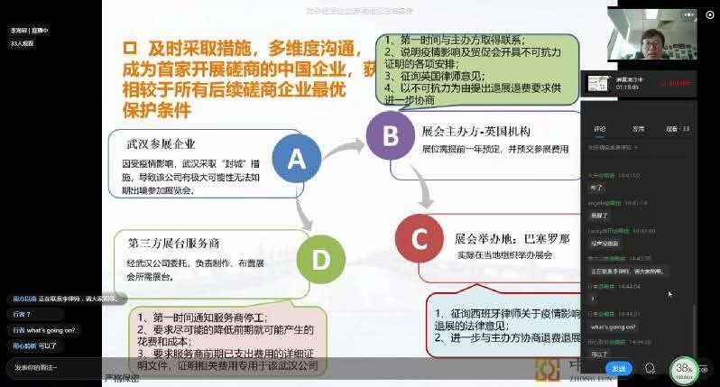 培训会上,北京市中伦律师事务所合伙人、律师李海容,首先介绍当前中美贸易摩擦、疫情全球蔓延导致跨境交易纠纷居高不下的形势,深入解读了执行境内裁决的重要法律依据《纽约公约》,详细介绍了涉外经贸合同签订阶段、争议发生之初及仲裁阶段的跨境维权“黄金期”,并结合重点实际案例解析了跨境维权的方法与手段,并从贸易管制风险,贸易合规尽职调查及贸易合规体系建设角度为外向型企业迎接国际合规挑战,提供了应对策略。最后,李律师与参会代表进行了线上互动交流。