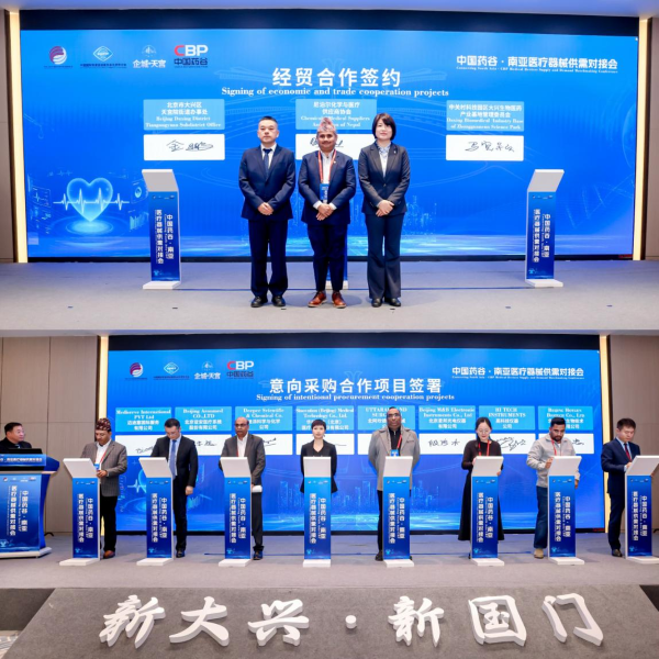 会上,大兴区天宫院街道办事处、大兴生物医药产业基地管委会、尼泊尔化学与医疗供应商协会共同签署了《经贸合作协议》。该协议将为三方建立长期稳定的战略合作机制,推动优质医疗器械产品、前沿技术和专业服务系统性、规模化进入南亚市场。同时,现场举行了迈迪塞国际服务有限公司、迪派科学与化学公司、北阿坎德外科器械公司、高科技仪器公司等南亚采购商,与北京谊安医疗系统股份有限公司、华科精准(北京)医疗设备股份有限公司、北京麦邦光电仪器有限公司、北京热景生物技术股份有限公司等多个意向采购合作项目签署,跨境商贸对接成效显著。